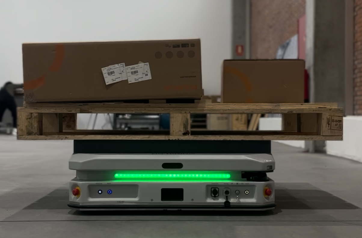 Integration of an AMR platform within a coordinated plant-wide robotic workflow for an existing production environment. Built to establish a fully automated material flow, it includes: