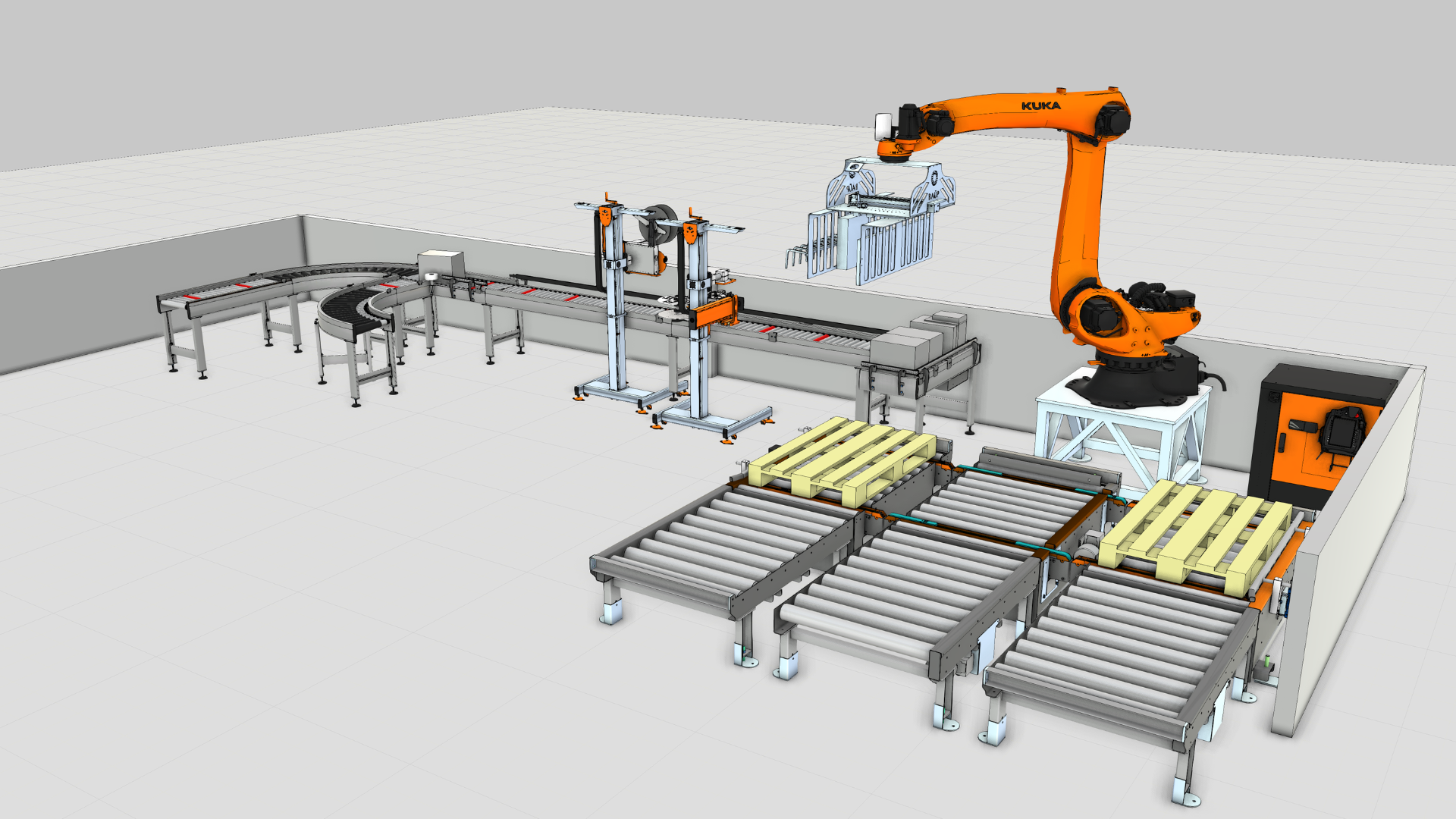 The system operates under variable production conditions, dynamically adapting to product type, sequence, and flow. A dedicated decision layer computes pallet configuration in real time, enabling the robot to execute optimized stacking patterns without predefined layouts.