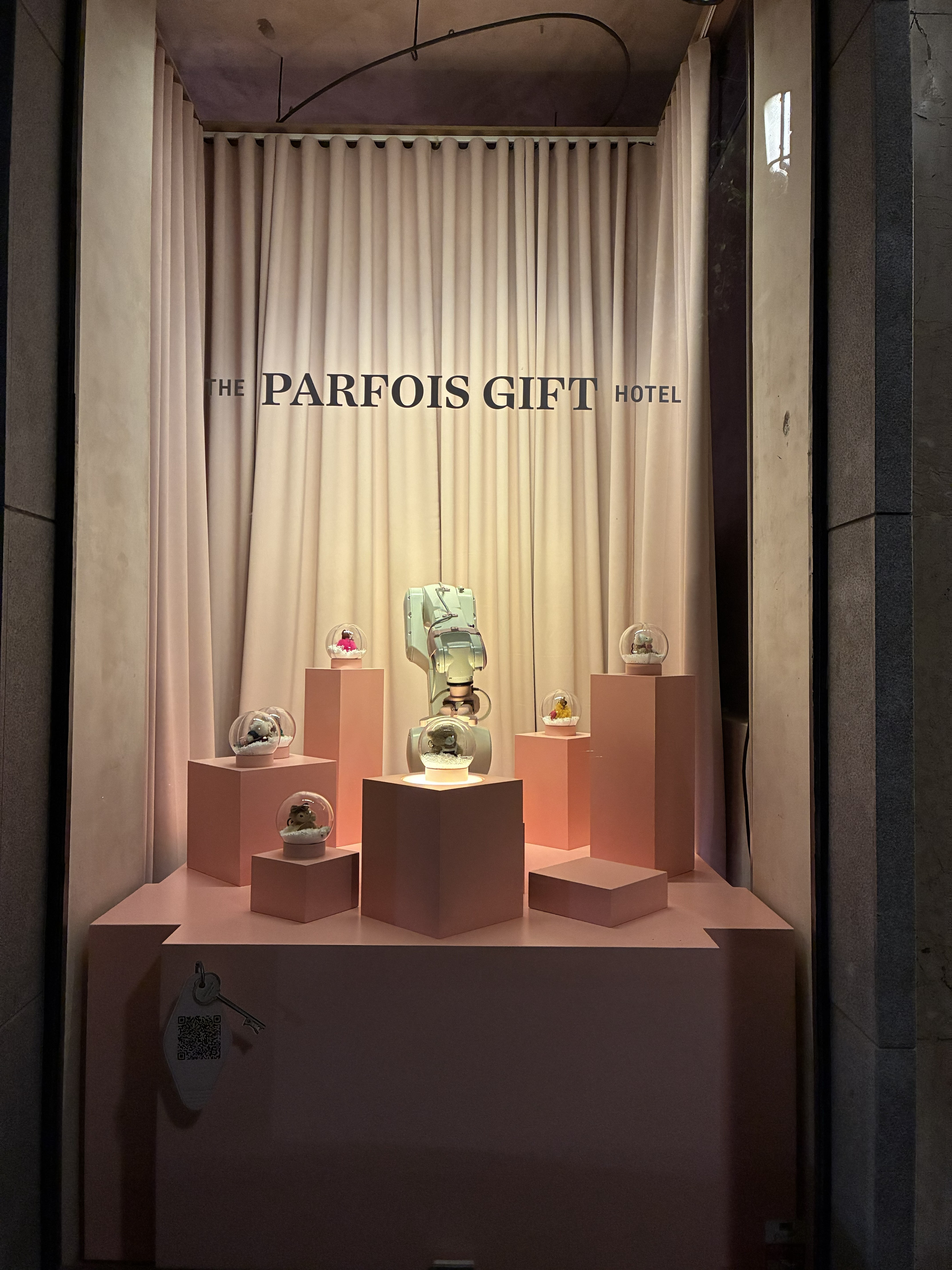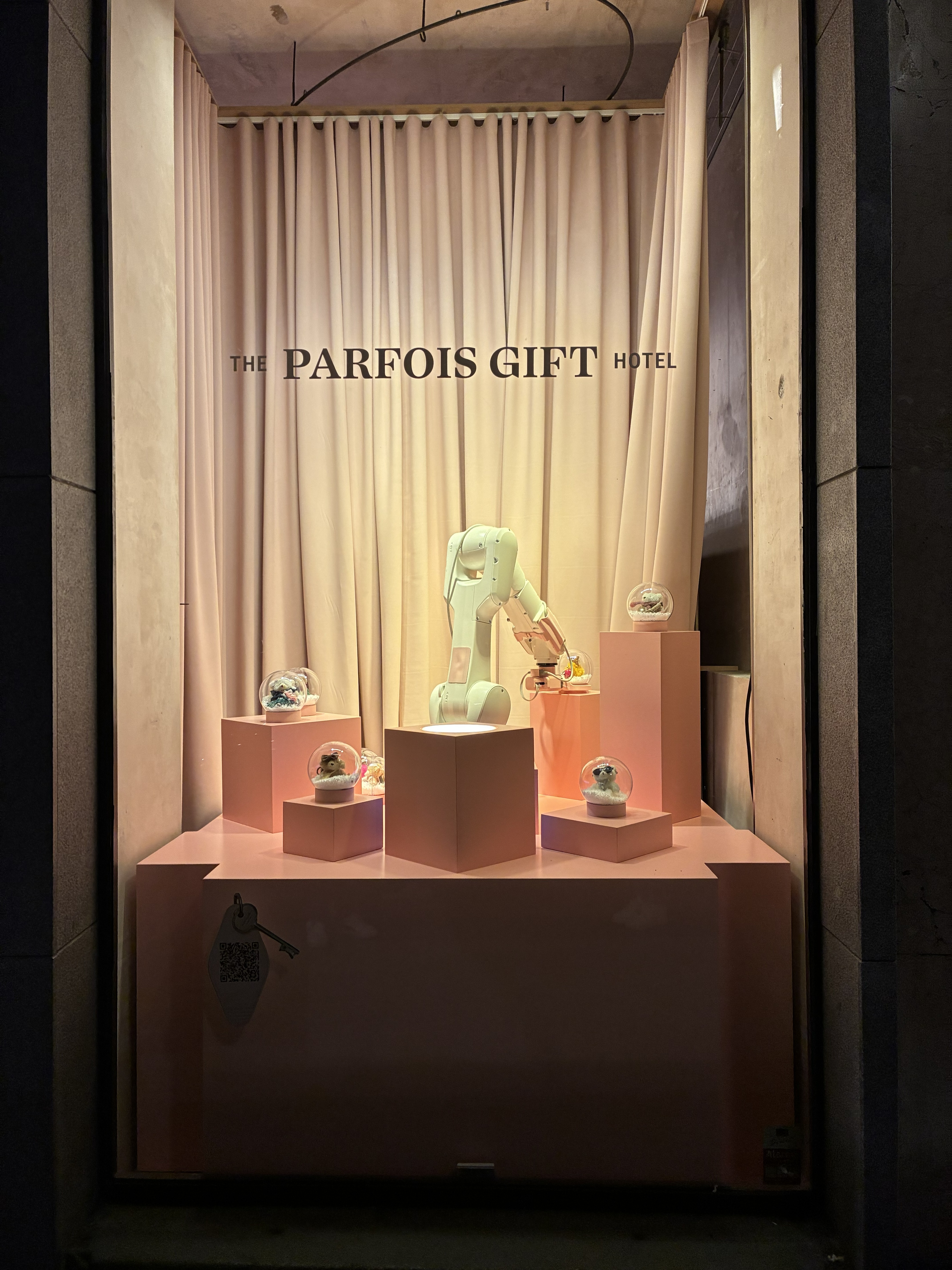 Developed in collaboration with Bagel Affairs for the Parfois pop-up store, this project features a robotic installation designed to operate continuously in a retail window environment, creating a 24/7 interactive experience.